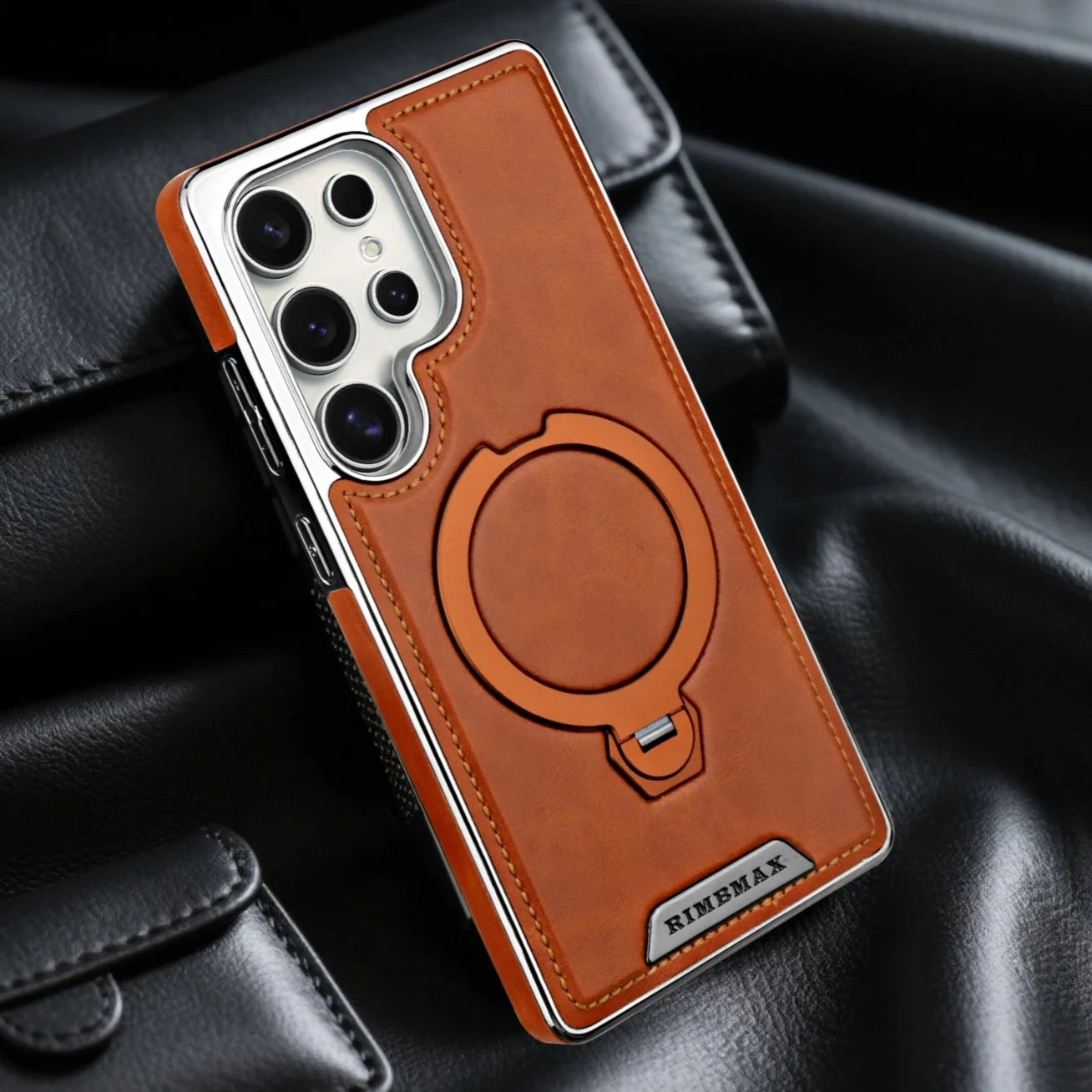 Case em Couro Samsung com Suporte Giratório Magnético. Rotação completa para assistir vídeos, chamadas de vídeo ou usar no carro com máxima praticidade.